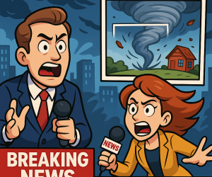 Write a lively breaking news script for a cartoon-style news anchor, incorporating an uploaded image.