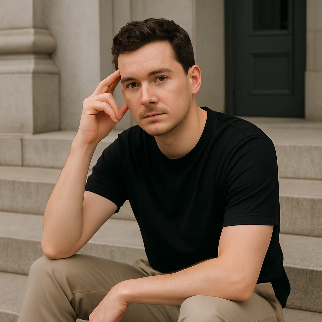 Generate a modern minimalist fashion portrait of me seated on outdoor stone steps in front of a city building entrance, preserving my real face. Pose me leaning slightly forward with left elbow on knee, hand touching temple thoughtfully, right arm relaxed with hand extended downward. Legs bent naturally, spread apart for a grounded stance. My gaze is steady and intense, looking directly at the camera with calm and powerful expression. Outfit details: black fitted turtleneck sweater under a tailored black coat with wide collar and matte texture, paired with slim black trousers; no accessories to maintain minimalism and sophistication. Background includes urban architecture with glass doors and warm interior lighting softly glowing, contrasting with the dark outfit. Lighting should be warm, diffused, with soft shadows to create cinematic depth. Camera angle is low, capturing from knees up, using a portrait lens focal length around 50-85mm to maintain natural proportions and shallow depth of field, keeping me sharply focused against softly blurred background. Style is cinematic, editorial fashion photography with a moody urban atmosphere and professional model aesthetic. Optionally upload a selfie for facial accuracy.