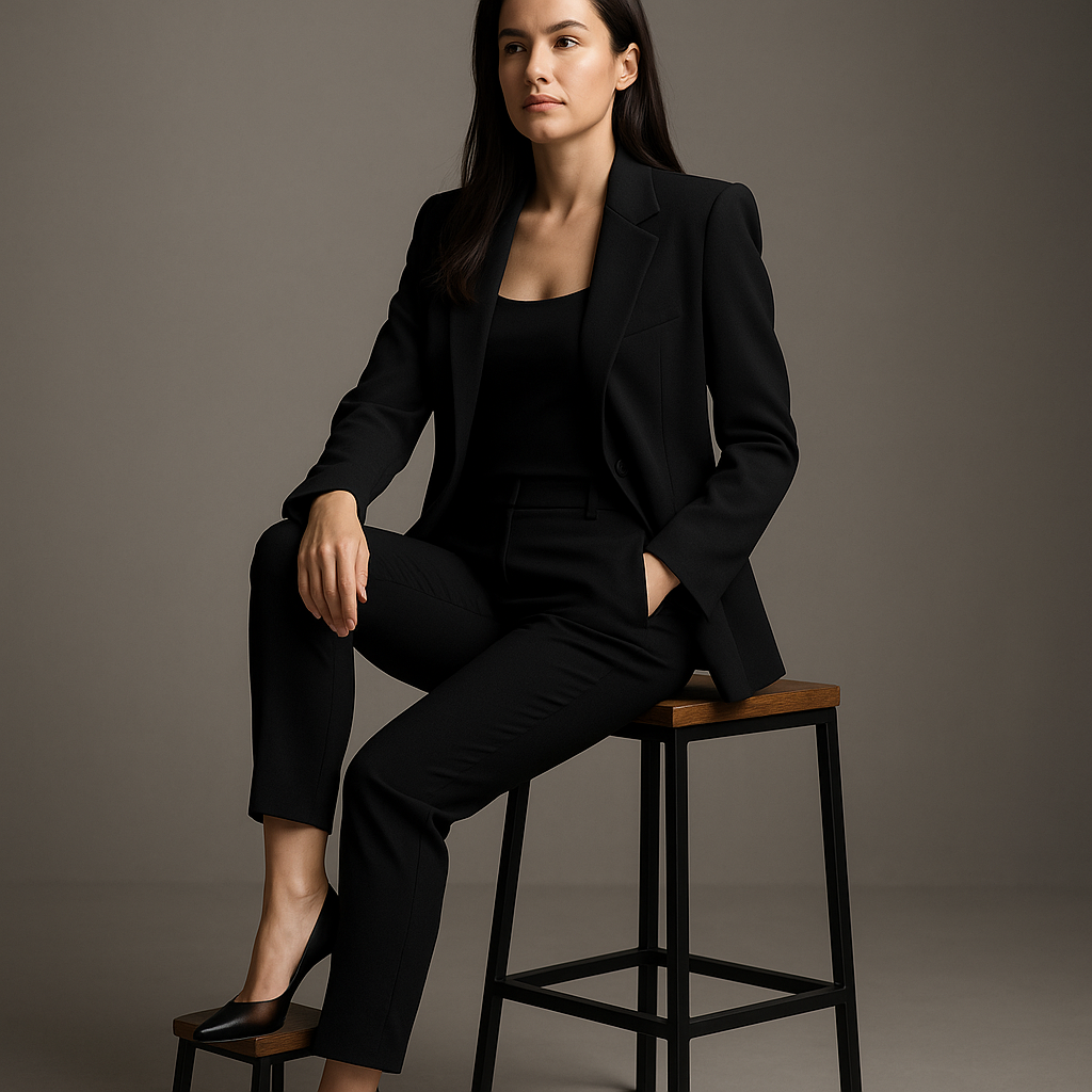 Using my uploaded photo as the base, recreate a full body portrait of a woman seated on a tall wooden bench with a black metal frame in a minimalist studio with a neutral grey background. Preserve the framing to capture the entire body with a slight distance to emphasize posture and clean environment. The model’s right leg is bent and resting on the bench step, the left leg gracefully touches the floor wearing black high-heeled shoes with translucent details. Outfit is fully black and elegant: structured blazer draped over shoulders, fitted tailored trousers, and a black top underneath, embodying strength, style, and professionalism. Hair is down, neatly styled, softly falling over shoulders. Expression is confident, gaze slightly to the side conveying power and serenity. Use soft, directional studio lighting to create balanced contrast highlighting fabric texture and facial contours. Background remains smooth with subtle grey gradient, distraction-free to keep focus on the model. Style is modern corporate editorial, realistic, professional photographic, refined magazine-quality composition. Vertical format (1080×1920), portrait ratio, premium photo quality, cinematic lighting, sophisticated tone. Include SEO keywords: ultra realistic photography, editorial portrait, fashion photography, corporate editorial style, cinematic lighting, premium photo quality, full body portrait, studio photography, professional model, neutral grey background, high fashion look, photorealistic render, 8K quality, sharp focus, clean composition, luxury aesthetic, modern fashion branding, AI image generation prompt.