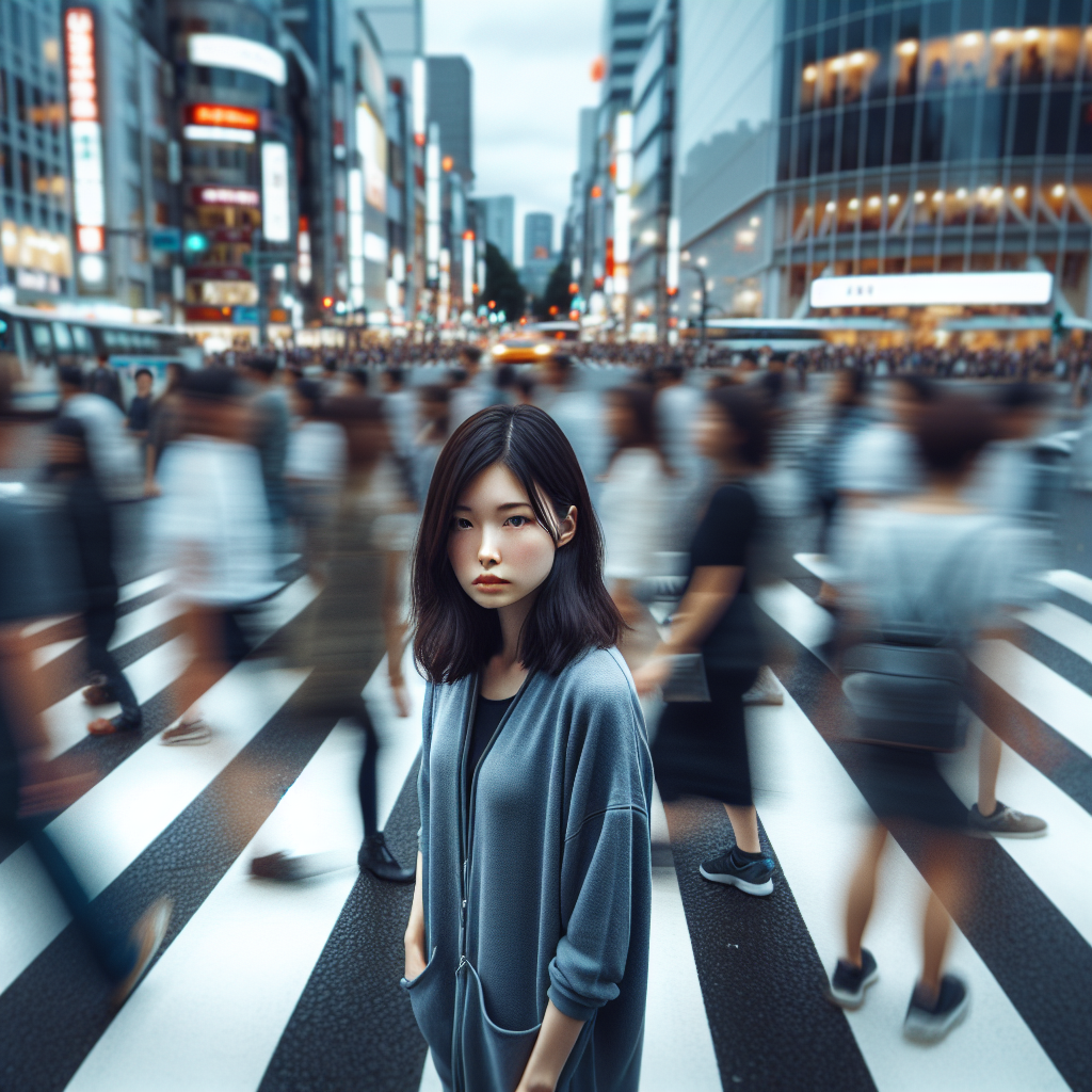 – Create an ultra-realistic street photography scene featuring a young woman standing motionless on a bustling city crosswalk, captured from a slightly elevated, extra long-range headshot perspective using a 50mm lens at f/2.8. The camera is angled downward, focusing tightly on her face with shallow depth of field, emphasizing cinematic soft lighting with darker tones and subtle contrast. She wears a minimalist casual outfit: loose black blazer over a dark shirt, slightly oversized black pants, and black sneakers. Her hair is wavy, and on her wrist is a single smart watch, with no other accessories. The background shows busy pedestrians rushing past in strong streaked motion blur, creating dynamic movement around her while preserving the clarity of her face. The scene features warm neutral light reflections on asphalt, rich shadows, and a moody atmosphere. Use PBR materials, global illumination, and cinematic motion blur effects for maximum realism. Avoid text, logos, heavy blur, distortion, bokeh balls, vignette, or any obstruction of the subject. Chaos 5, aspect ratio 9:16, raw, stylize 250. Option to upload a face reference for precise likeness.